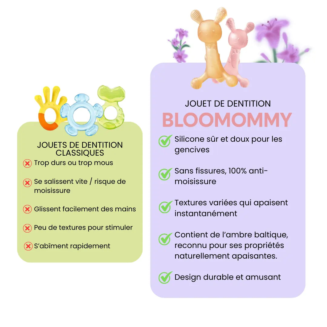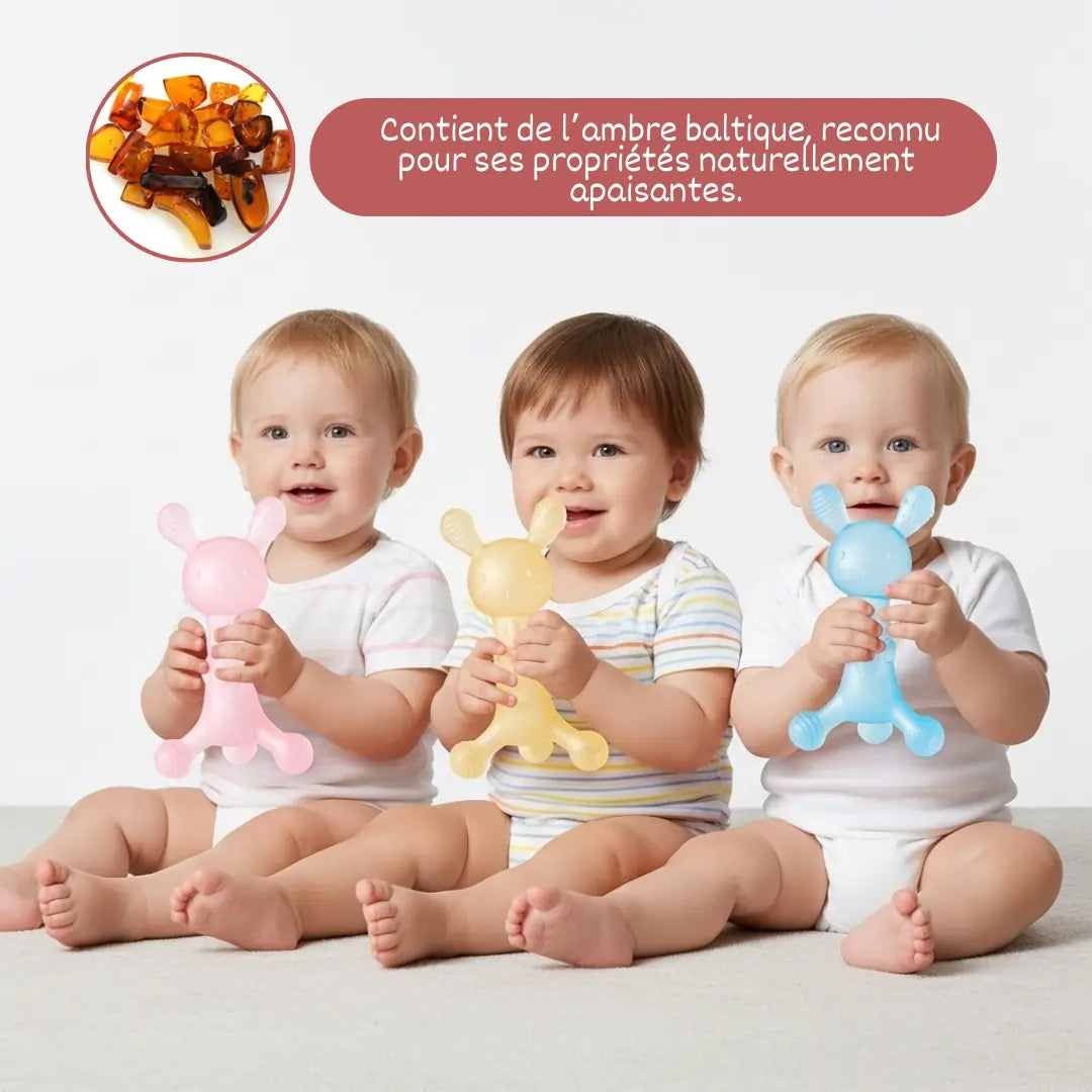 SAGESSE ANCESTRALE ET DESIGN MODERNE - Notre anneau de dentition exploite les bienfaits éprouvés de l'ambre baltique et du caoutchouc naturel, des matériaux prisés depuis des siècles en Europe et en Asie, dans un design contemporain adapté aux enfants.