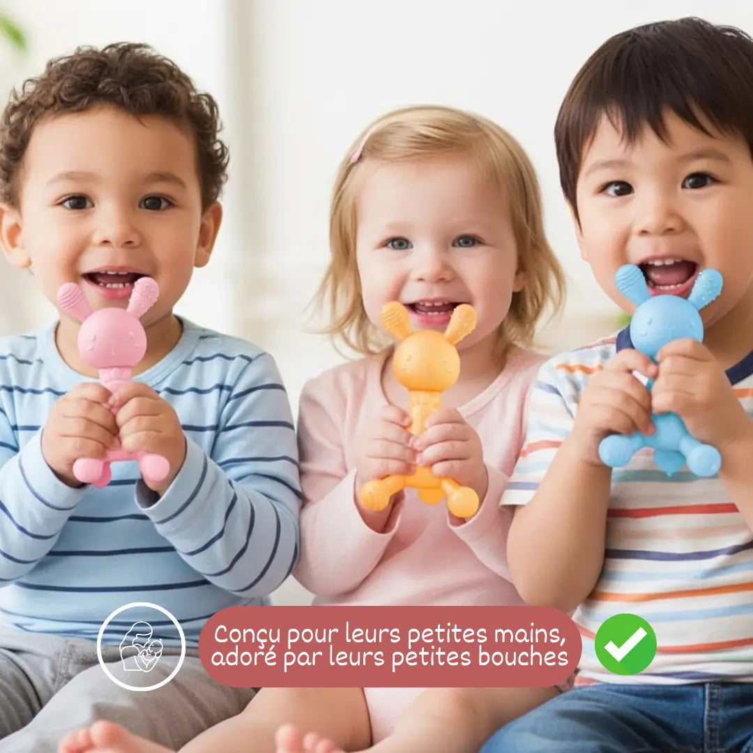 ERGONOMIE ADAPTÉE AUX BÉBÉS - Conçu avec soin pour les petites mains, cet anneau de dentition lapin est facile à saisir et à explorer pour les nourrissons. Les différentes textures du design encouragent la découverte tactile et offrent diverses surfaces apaisantes pour les gencives sensibles.